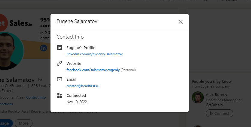 On Eugene’s profile, you can find his email address in the contact information section. It’s worth noting that not all LinkedIn users are willing to share their contact information in this manner.