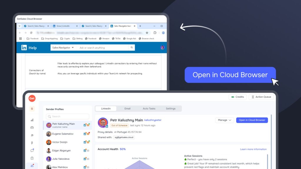 GetSales solves this with our Single Session Protection architecture, built around GoLogin and our integrated Cloud Browser. Instead of creating new sessions, our infrastructure lets you maintain one persistent, active connection per account. This means work resumes directly from a secure cloud environment where the profile stays logged in, mimicking a real user who keeps their browser tab open for weeks. This process also lets your team manage client accounts without ever sharing sensitive 2FA secrets or passwords, ensuring your technical footprint remains unified and hidden from session trackers, which highly improves LinkedIn automation safety.